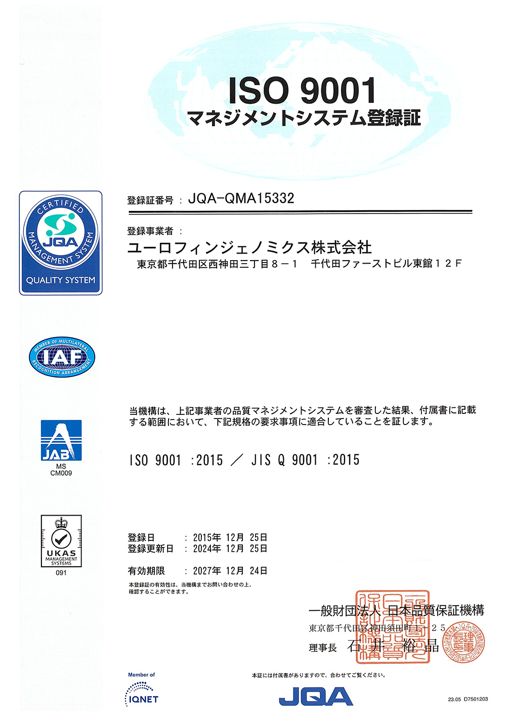 ユーロフィンジェノミクス株式会社は、品質マネジメントの国際規格ISO9001:2015認証のもと、弊社サービスの品質向上に取組んでおります。