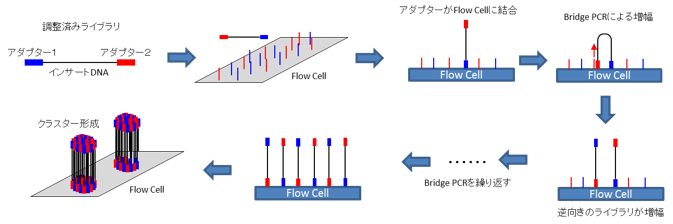 Flow Cell上にライブラリDNAを結合させ、Bridge PCRによりクラスタを形成します。