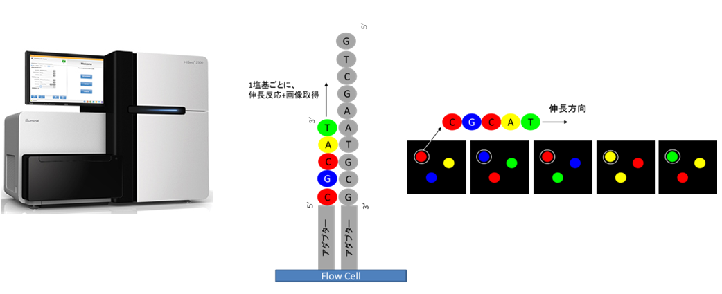 Sequence by Synthesis法により、1塩基ずつ伸長反応を行います。各伸長反応ごとに画像を取得し、画像情報から塩基配列を決定します。